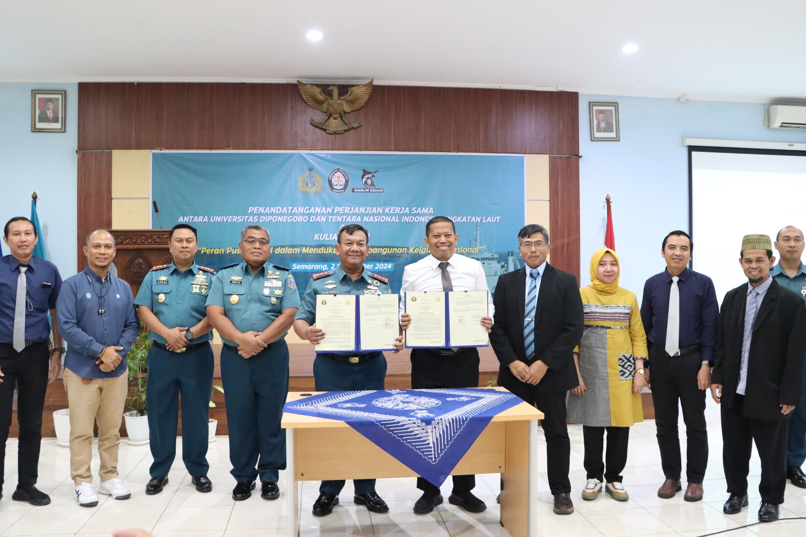 FPIK, SEMARANG – Senin (02/09) Rektor Universitas Diponegoro (Undip) Prof. Dr. Suharnomo, S.E., M.Si. telah melakukan Penandatanganan Perjanjian Kerja Sama (PKS) antara Undip dengan TNI Angkatan Laut (TNI AL) yang diwakili oleh Laksamana Madya TNI Dr. Budi Purwanto, S.T., M.M., selaku Komandan Pusat Hidro-Oseanografi TNI AL (Pushidrosal). Bertempat di Auditorium Fakultas Perikanan dan Ilmu Kelautan Universitas Diponegoro (FPIK Undip), penandatanganan kerja sama ini bertujuan untuk mendukung pelaksanaan pendidikan dan penelitian di Undip guna mendukung penyelenggaraan tugas di bidang Hidro-Oseanografi yang diemban oleh TNI AL serta untuk meningkatkan kualitas sumber daya manusia dalam bidang kelautan khususnya Hidro-Oseanografi melalui pelatihan dan penelitian untuk kepentingan bersama.