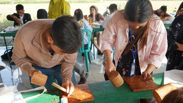 Usai kegiatan konservasi, peserta mengunjungi Dekranasda Jepara, Nalendra Gallery, dan sentra ukir Desa Petekeyan. Di sini, mereka tidak hanya belajar tentang keindahan batik dan seni ukir Jepara, tetapi juga berkesempatan mencoba langsung proses membatik dan mengukir kayu di bawah bimbingan para pengrajin lokal. Pengalaman ini menjadi simbol perpaduan antara kearifan lokal dan semangat global dalam menjaga kelestarian budaya dan lingkungan.