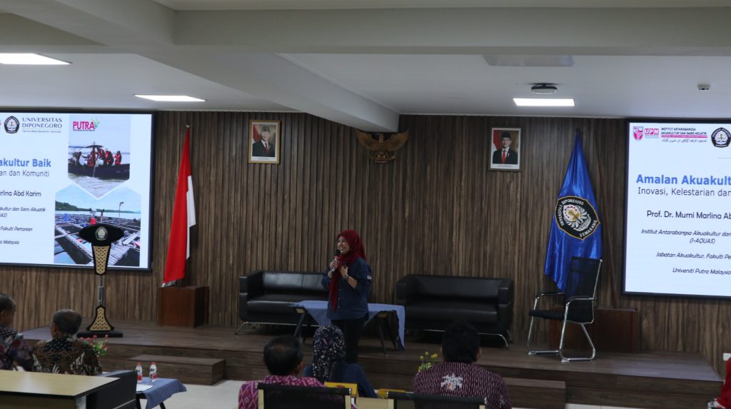 Pembicara berikutnya, Prof. Murni Marlina Abd. Karim (Universiti Putra Malaysia), mengangkat isu tantangan utama akuakultur seperti penyakit, pencemaran, dan penggunaan antibiotik berlebih.