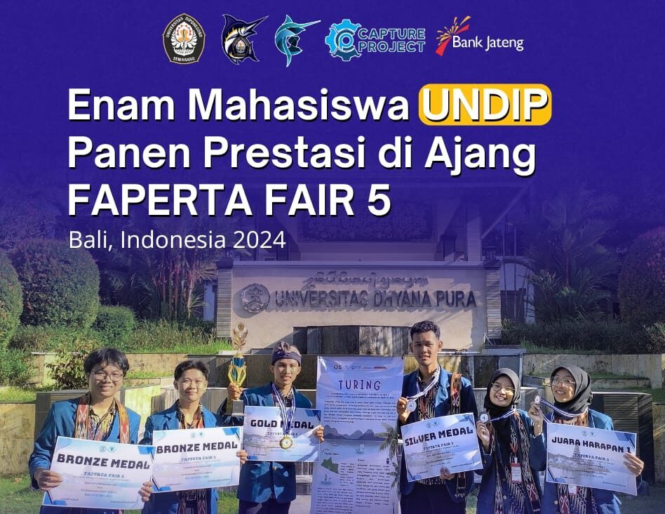 FPIK, SEMARANG – Five students of the Faculty of Fisheries and Marine Science (FPIK) and one student of the Vocational School of Diponegoro University managed to win several categories at the Futuristics and Prestige Research, Technology and Art (FAPERTA) Fair 5 competition which took place on 18-19 May 2024 at Dhyana Pura University, Bali. The FAPERTA Fair is a national level essay competition organised by Sentosa Foundation. In this competition, the team consisted of five students of FPIK and one student from the vocational school won Gold Medal in the Environmental theme (Essay category), Silver Medal in the HSE theme (Poster category), Bronze Medal in the Environmental theme (Essay category), Bronze Medal in the Technology theme (Essay category), and became 3rd Runner Up. The five FPIK students who successfully achieved these achievements are students from the Capture Fisheries Department, namely: